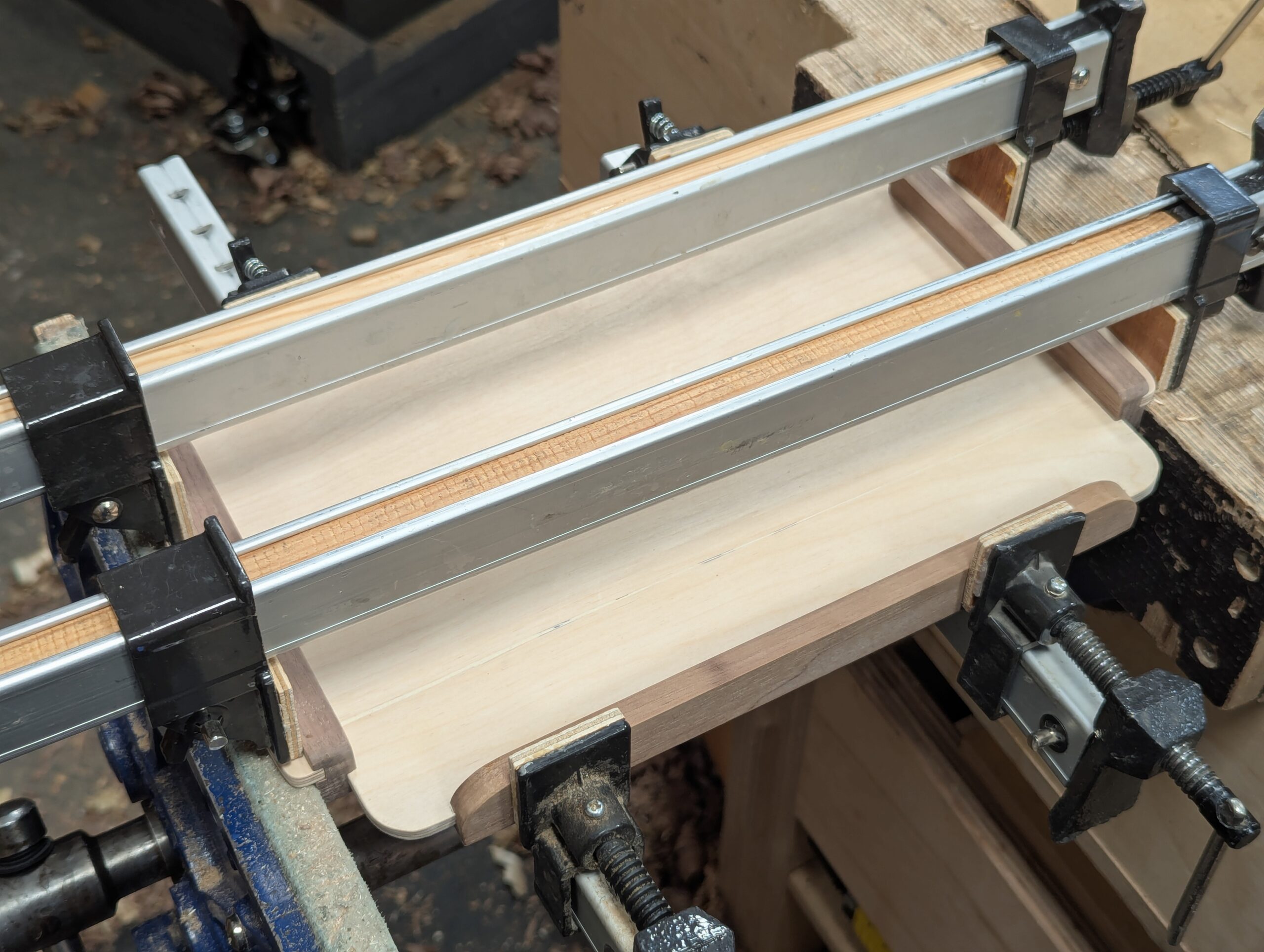 Clamping with tight and well-fitting plywood into the grooves is simple, just a basic plough plane, perhaps a single swipe on the plywood with either a plane or cabinet scraper, and you're ready for a single bead of glue. I used pressure top and bottom where the handles are.