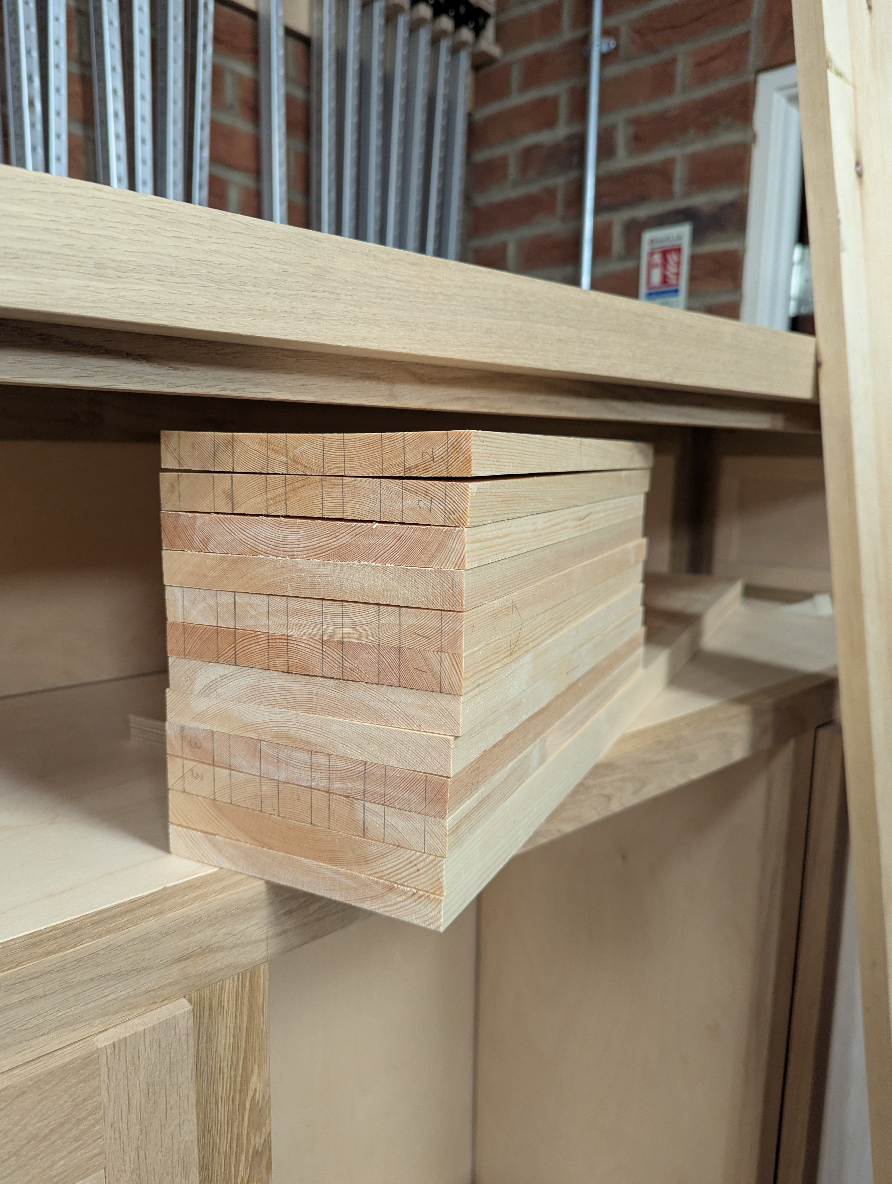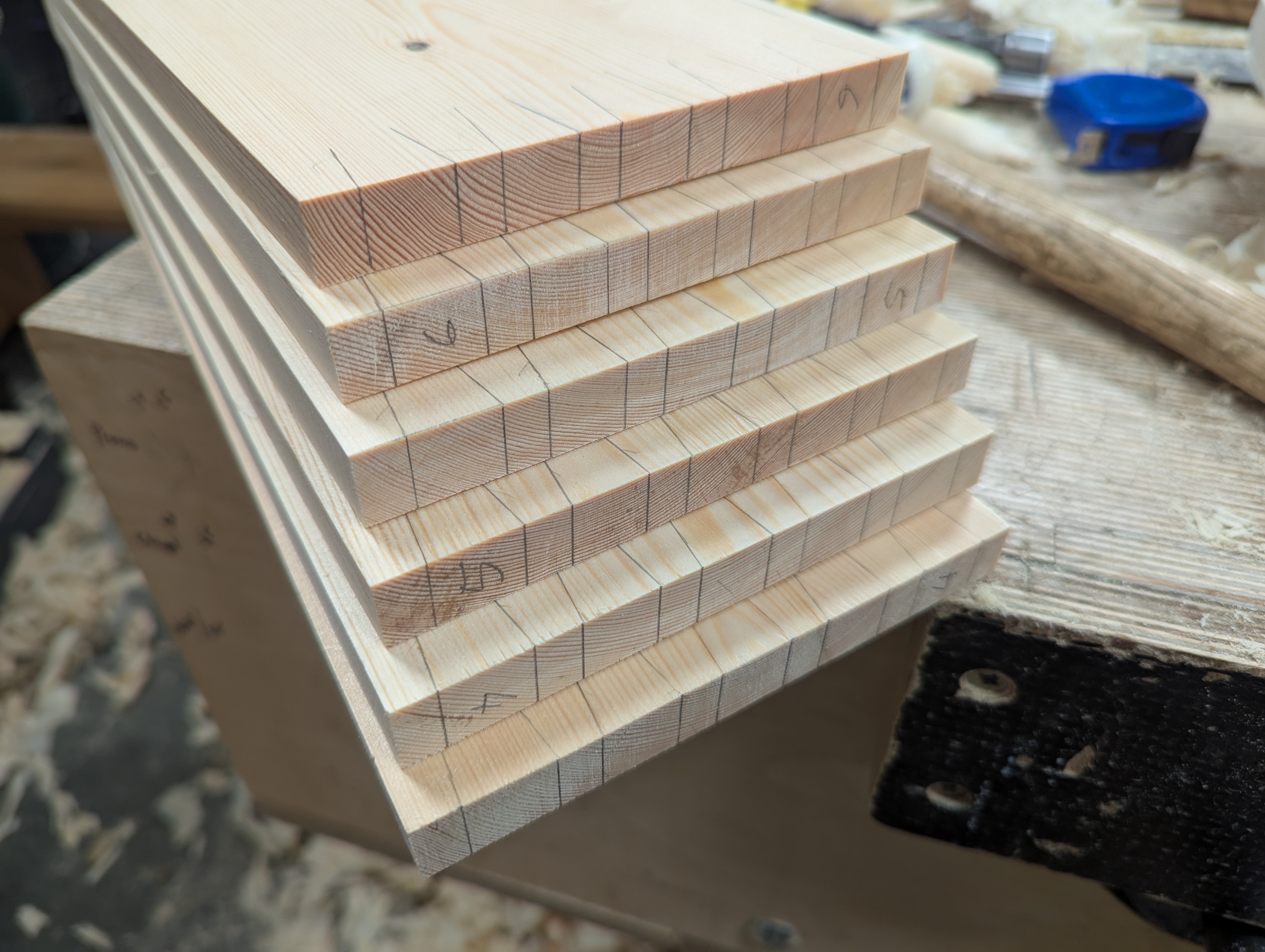 First off, I planed out the humped sides of the pieces to establish flat surfaces on those sides, and then focussed on removing twist. Every piece had twist large and small. Cutting them near to length and width minimised exaggeration ahead of the work, so crosscutting and width cutting is always essential when everything you do is by hand using hand tools only. With so many pieces throughout this project, I have used a Bosch jigsaw in places. About half, I would say.
