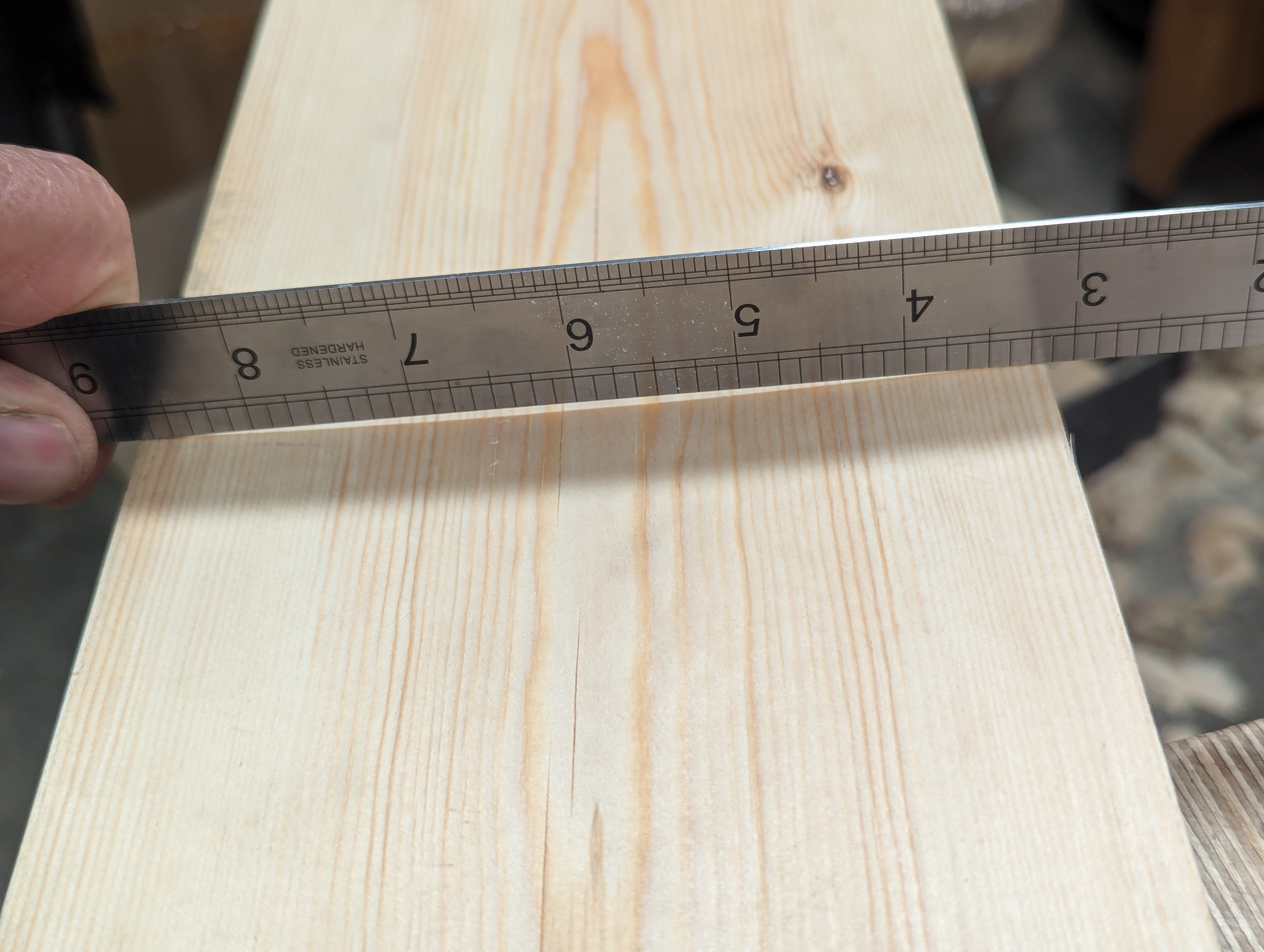Setting a marking gauge to the 5/8" thickness and running the gauge lines along the edges and ends readily establishes the guiding lines to plane the opposite face to. I'm not obsessed about dead thickness, though. I use my head when using all my own muscle and sinew, adopt a more practical perspective. Adding or subtracting a half millimetre either way is not too much of a difference but more my own accepting and deference of it to me. i'm simply prepared to work with it and make adjustments others will never notice or know of or see in the end result. Parallelity is usually critically important, and I aim for that, but I can even fudge there if I want/need to. In such cases, I count plane strokes here and there as I plane, knowing without checking that I am indeed as humanly parallel as possible. These small guestimates always work for me now after all these decades, and they are fast. Ultimately, my end product is comfortably progressive in the making and doesn't put me on any kind of conveyor belt.