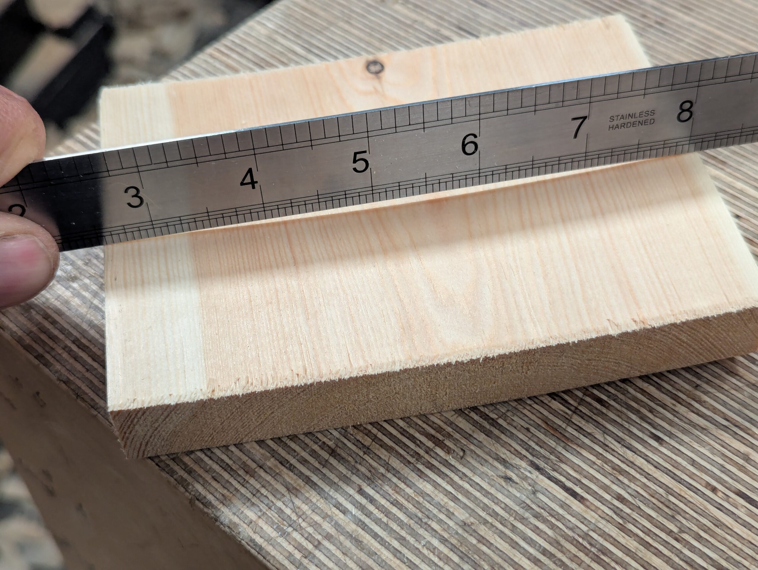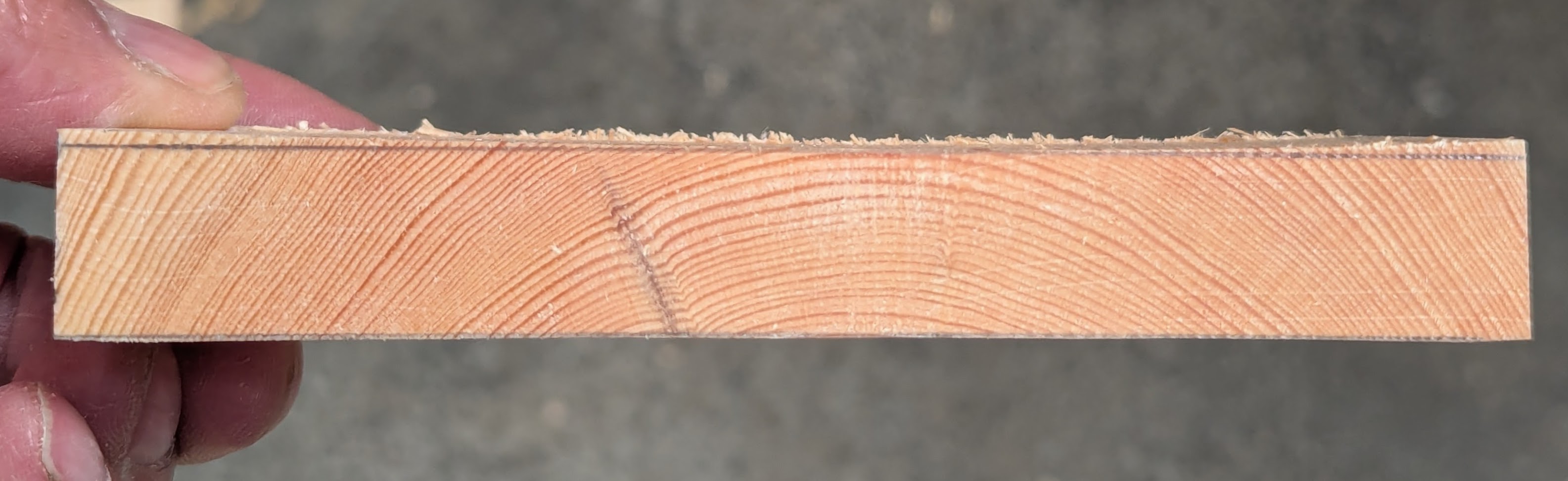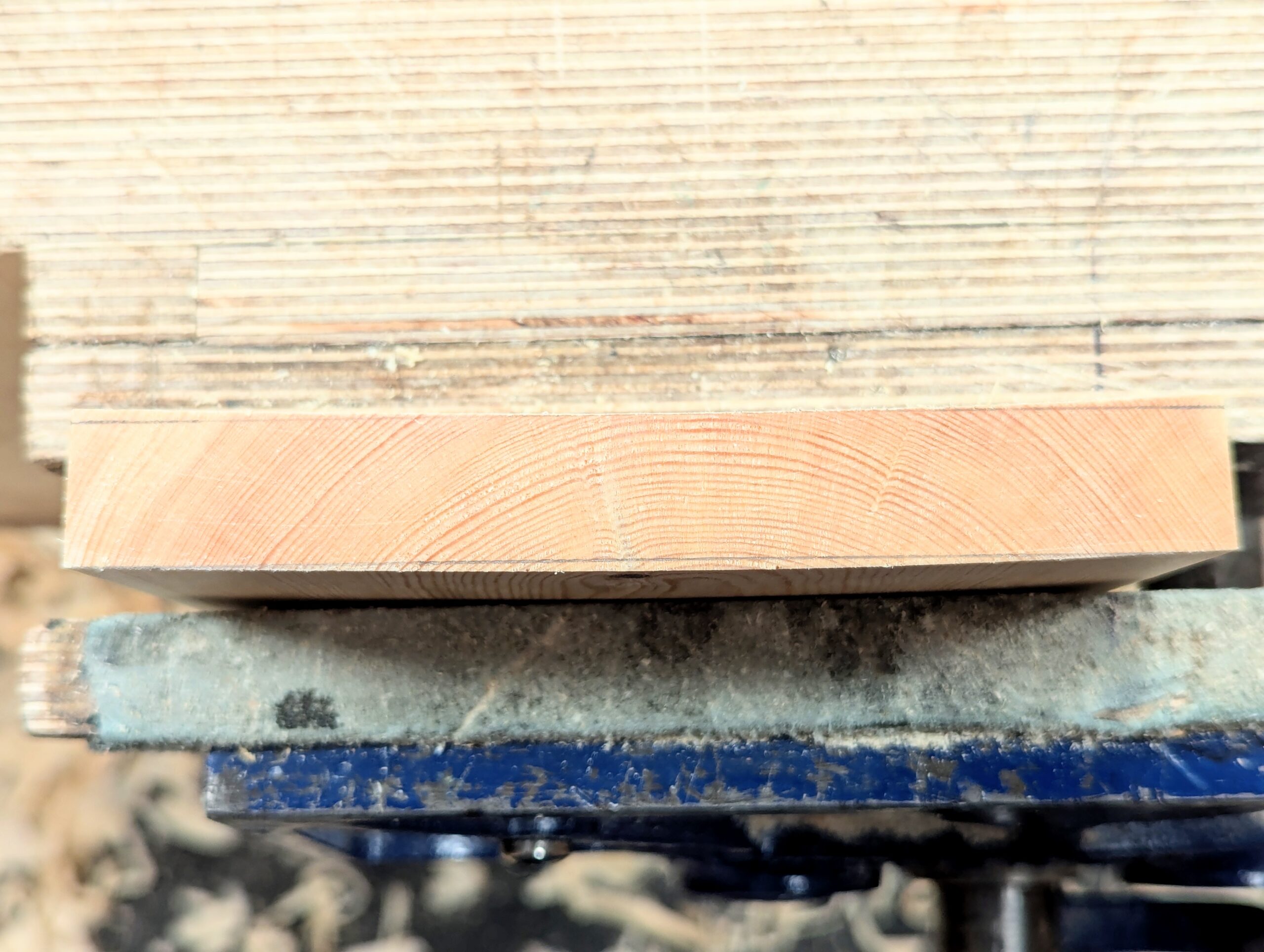 By the time the cup and twist are removed from the initial registration faces, the thickness is not too far from my final desired size. Let's discuss this first. In my case, here, the wood has a hollow of 1mm, about 1/32" give or take. That means, S4S, the opposite face will have a belly or camber on it of the same amount.