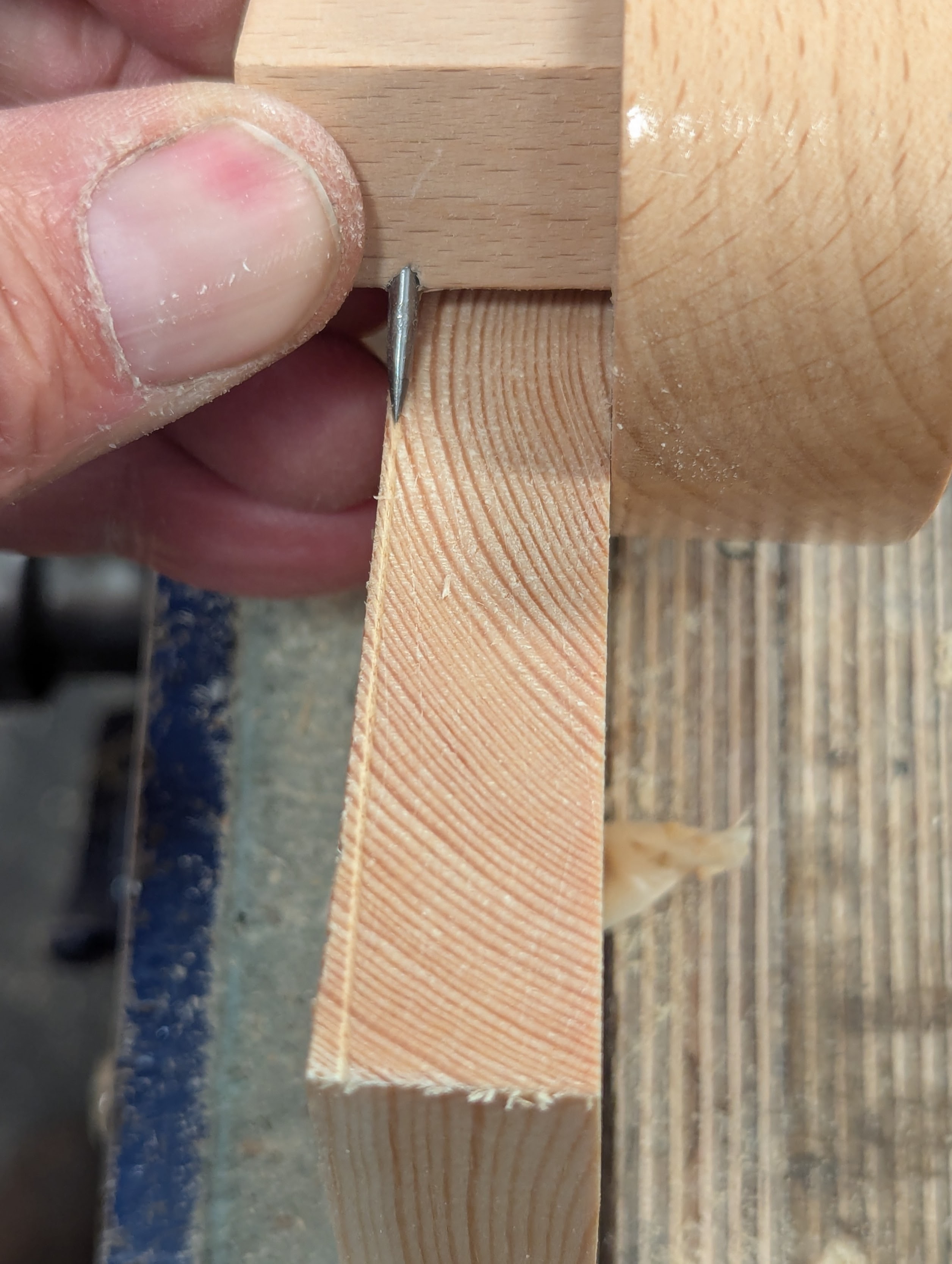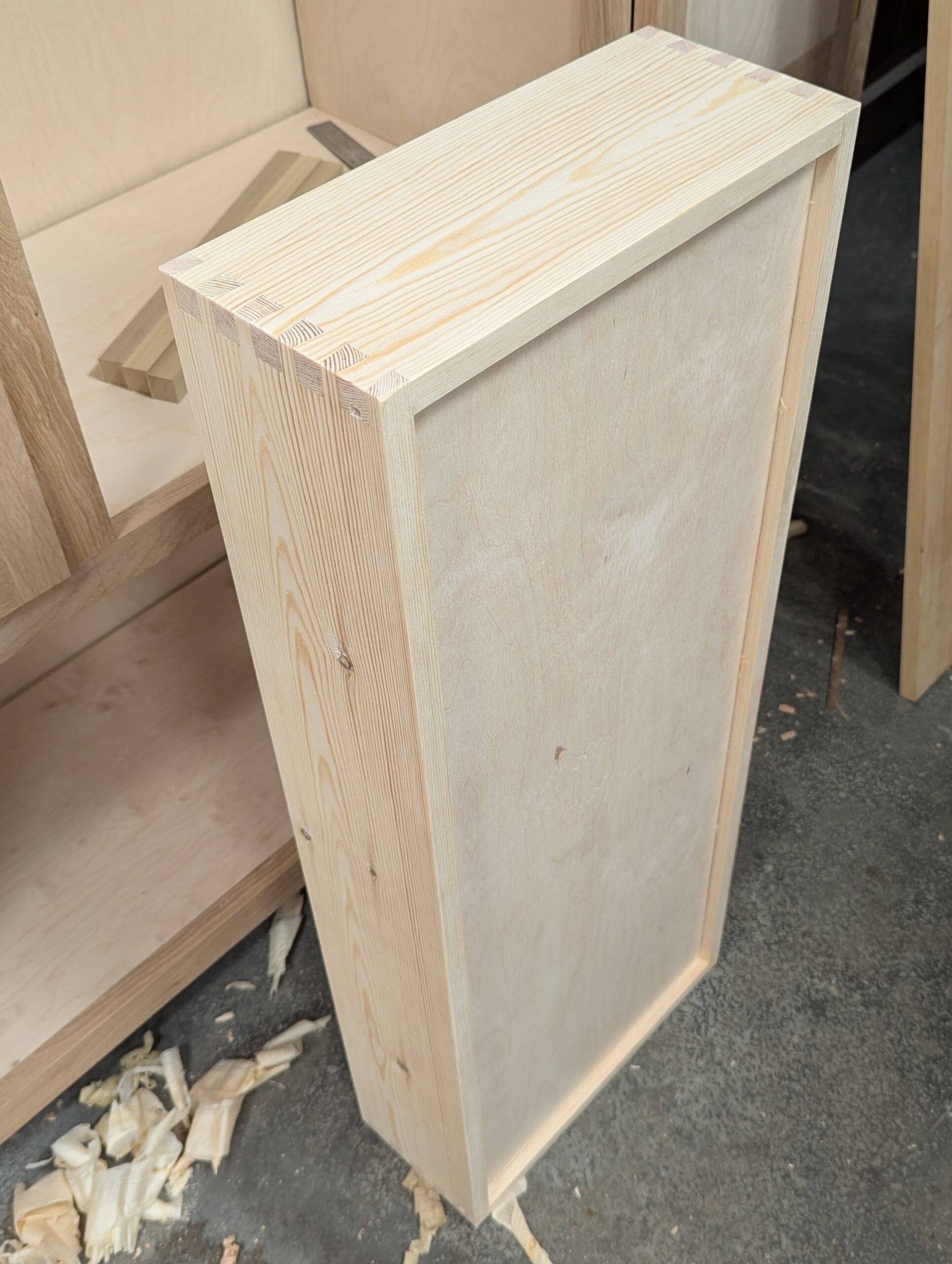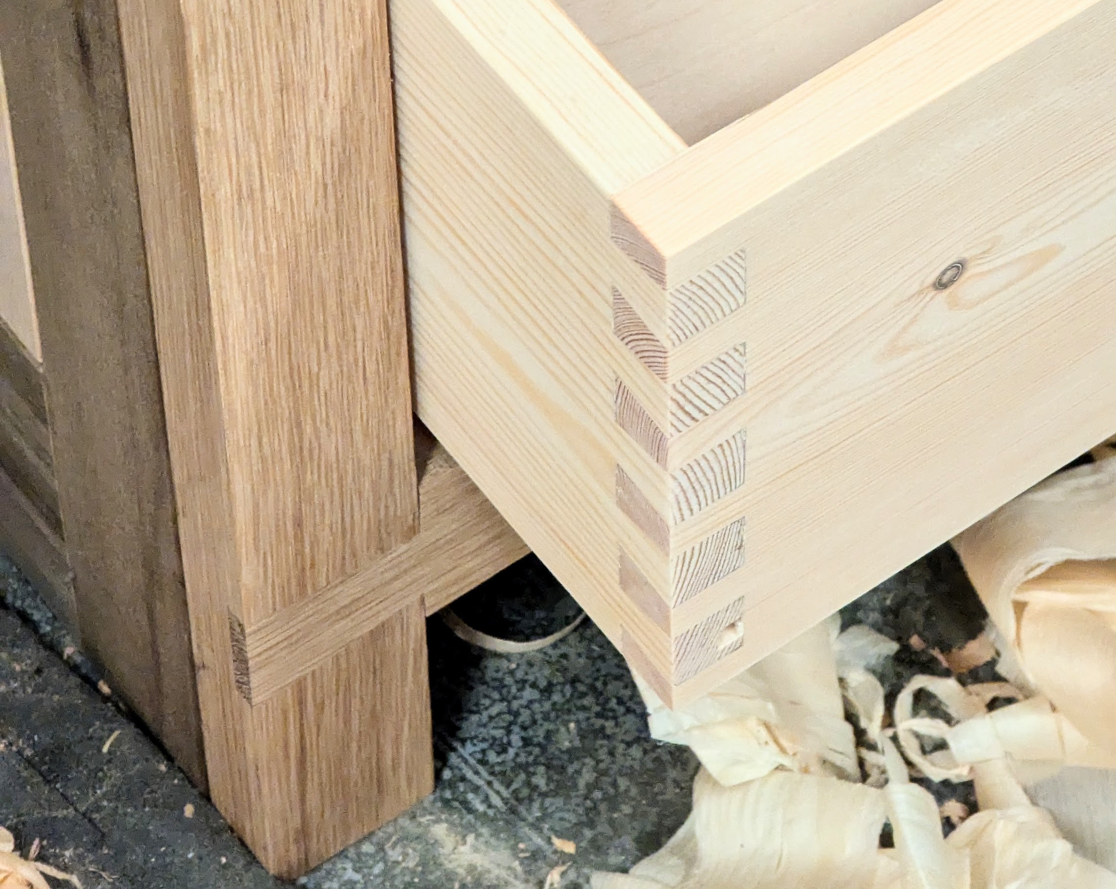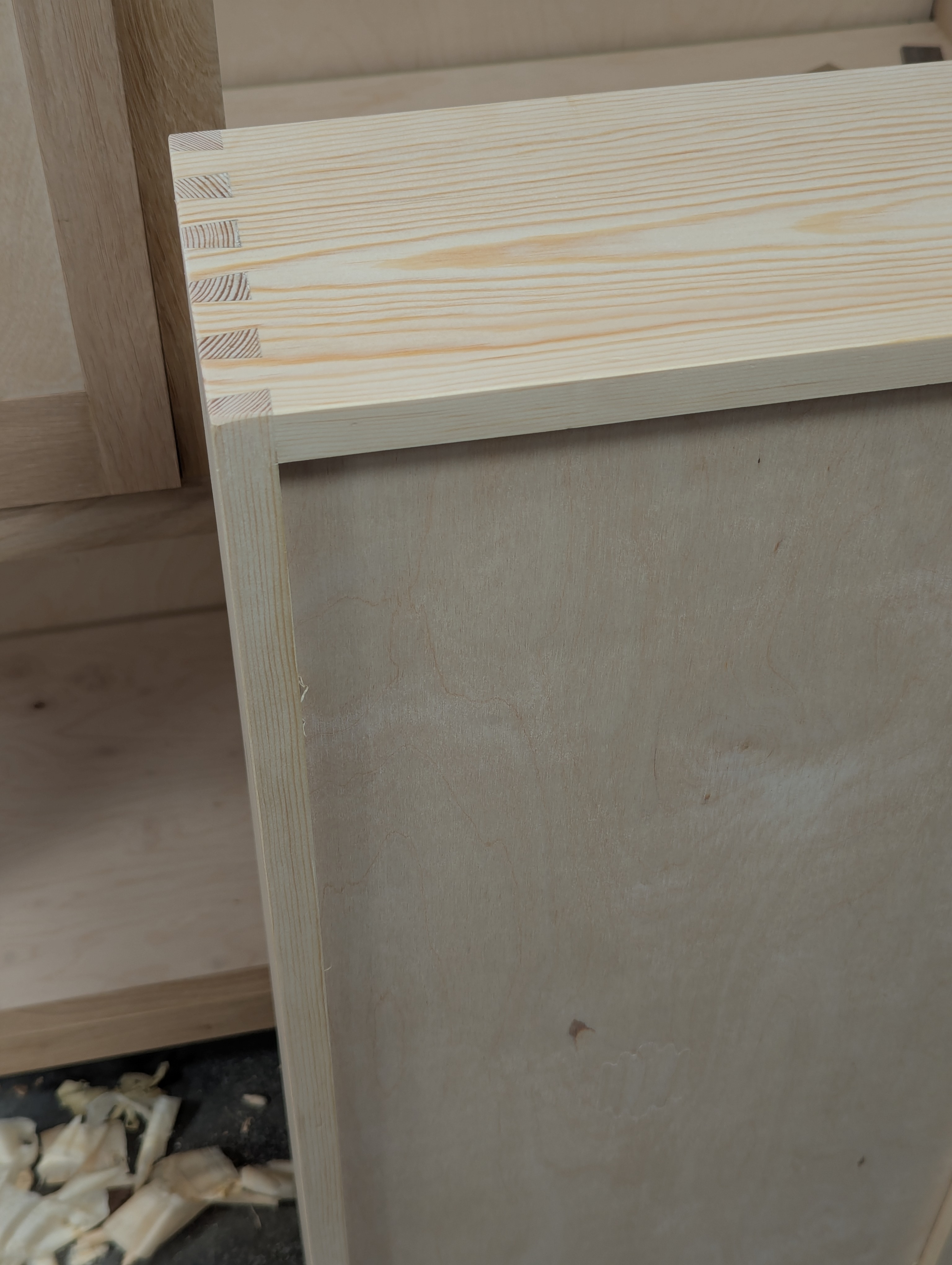 The first drawer came together perfectly once the wood was reworked to final size. Cutting all four dovetails was around 15 minutes per corner (with five dovetails) apart from the filmed one which takes longer because of filming and the necessary stops for filming needs. The drawer bottom, grooved by hand, took me about 15 minutes, and gluing up about ten minutes more. You must move very quickly with five tails in pine as the wood surface fibres being glued swell rapidly and any slowdown can prevent the joint from going together.