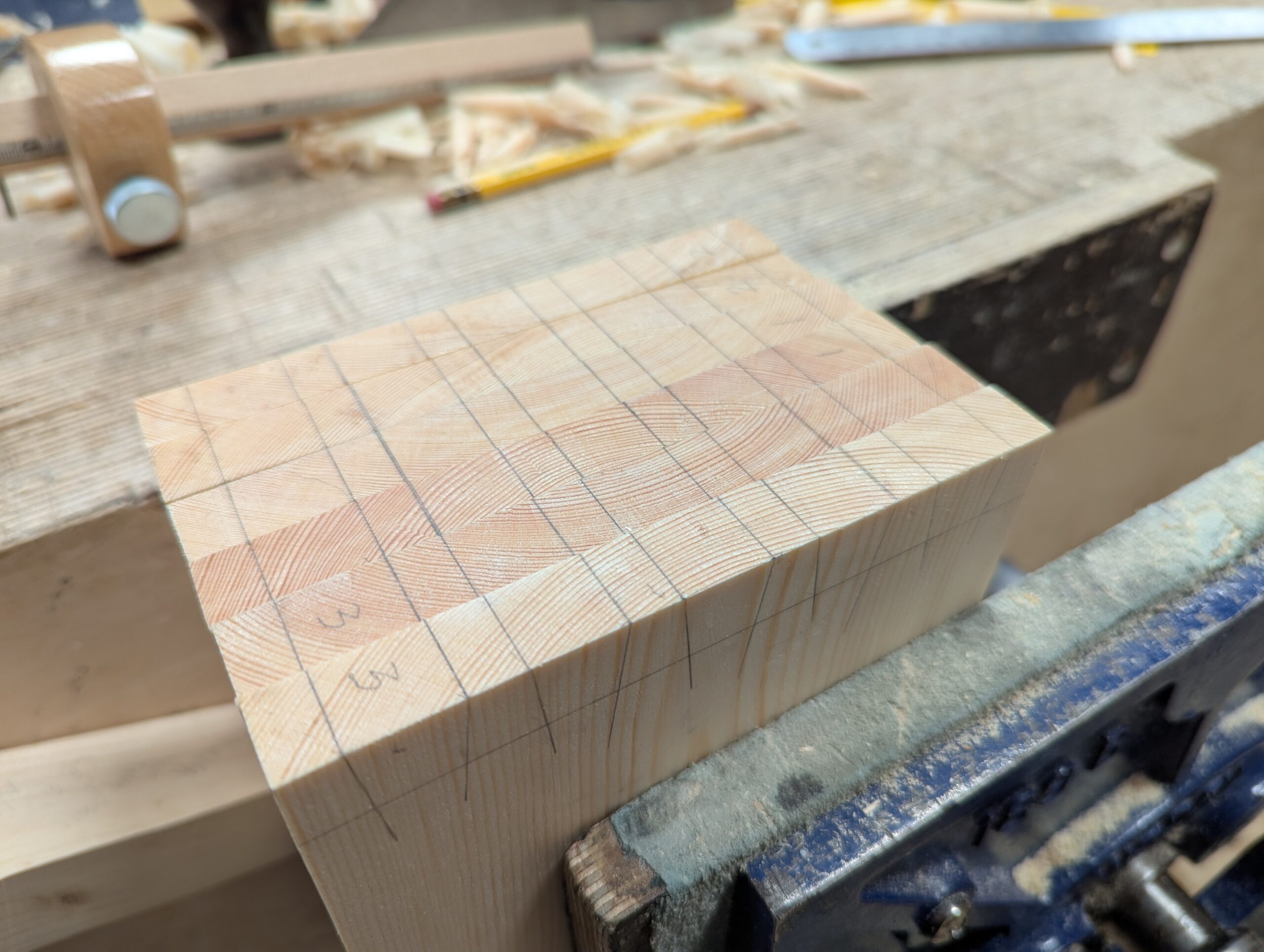 With all the drawer depths from front to back the same length, I plane them individually to size, stack them neatly and then lay out the dovetail sizes on one and clamp the others with it in the vise to transfer my work lines on all of the other side pieces. The whole process of planing my wood is about two hours. The laying out is an hour or so for the four drawers. From then on, cutting and making the drawer corners is 15 minutes per corner, so around a comfortable hour's work. Why did I mention the bench height? For layout and planing my wood, the height that works well and best for me and every average height male has left me with zero back or neck pain throughout my 60 years of daily woodworking by hand is 38". I'm five eleven. 6,500 students worked at my 38" high workbenches over extended periods, and not one of them ever found the benches uncomfortable.