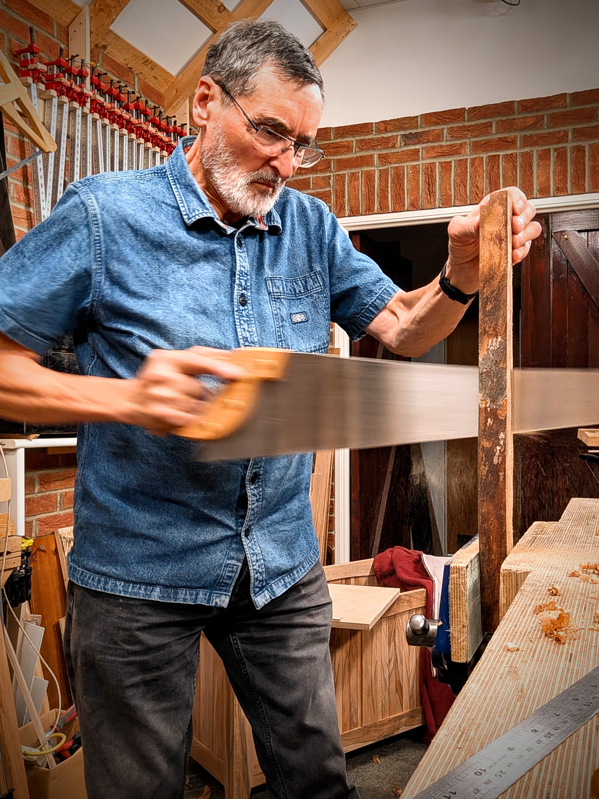 The reality of woodworking the way I prefer to do it is the reward of its deeper discovery. Take for instance science and tests; I've discovered many things about wood that tell me science has a place, but not the whole answer. Most often it takes you off on a rabbit trail that's mainly inconsequential to actual woodworking, a tangent that can be somewhat interesting, but when it comes to working its fibres it's of no help at all. Working with the wood for the cabinet above, two hundred pieces of it, planed four sides, so 800 surfaces in all, I convinced myself non-scientifically that the Janka hardness method of gauging wood hardness is mostly unhelpful. It was the same when I considered the answer in my previous post on mesquite and its workability with hand tools needing different strategies. Hardness itself is a minor consideration, and that's because additional factors regarding characteristics and workability cannot be addressed by pressing a steel ball bearing into the wood to see how deep it goes. This is where science and practice go their separate ways. it's precisely the same with machinists machining wood compared to those of us who work it with hand tools. Of course, machining wood for industry is an absolute essential now that time has moved on two hundred years. But you will never understand the idiosyncrasies of different woods by passing it into a tablesaw or power planer. The chopsaw pastramis the cuts into a gazillion tiny chips of crumbly particles and floaty dust for contamination you breathe in, but it does so absolutely effortlessly and leaves the end cut pristinely smooth and square. Not what we want, no! We want the harder, more high-demand workout because we are in constant training, like any athlete should be. To achieve good results using our hand tool methods takes considerable effort, much more than the machinist gets ,that's for certain, but in the act of working it with a handsaw, a plane, following a knifewall pressed firmly and deliberately to the square, such like that, you get both the physical and mental exercise and the inside knowledge of the wood in a real and tangible way and at the same time living and working in an unpolluted space. This alone means you will always be relating to your wood and the work very differently, and there is a romance to it that we hand tool makers just love and live for.