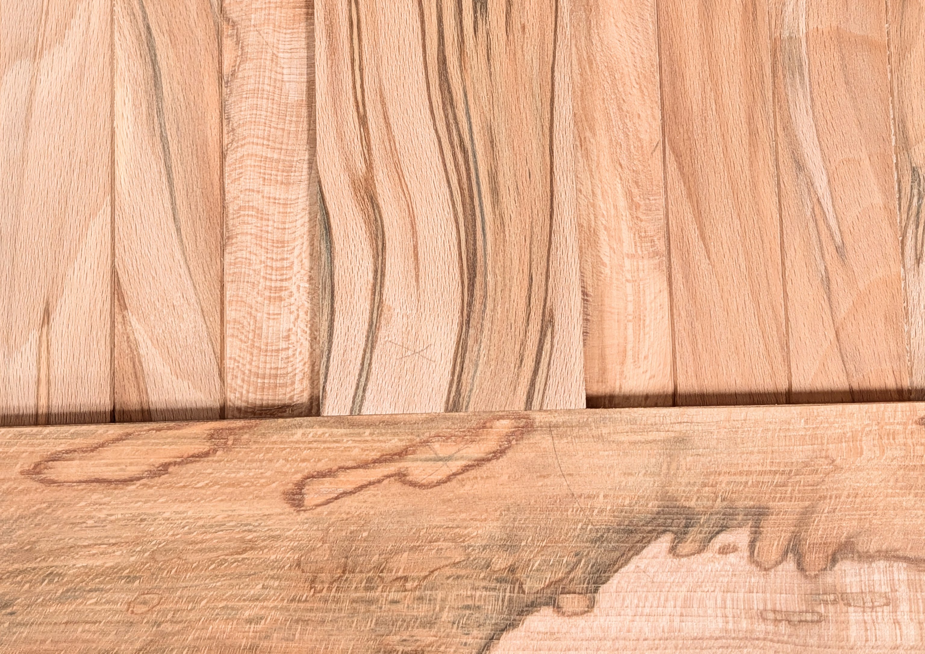 I know! It's the busiest of grain types; a diverse switch from any beech wood you might know because beech is not known for diversity and this wood I have chosen gives volume and depth that might seem distractive but yet, just like the mould of spalting, it creeps in to grow on you to the point that you just cannot put it down. I bought pretty much a whole tree of the wood and still have half a dozen seven-foot lengths to make from. The boards had been badly stored, hence the spalting. Six years in the wet and under a leaking tarp mid-Britain produced the reward of spalted wood, and another's neglect became my gain.