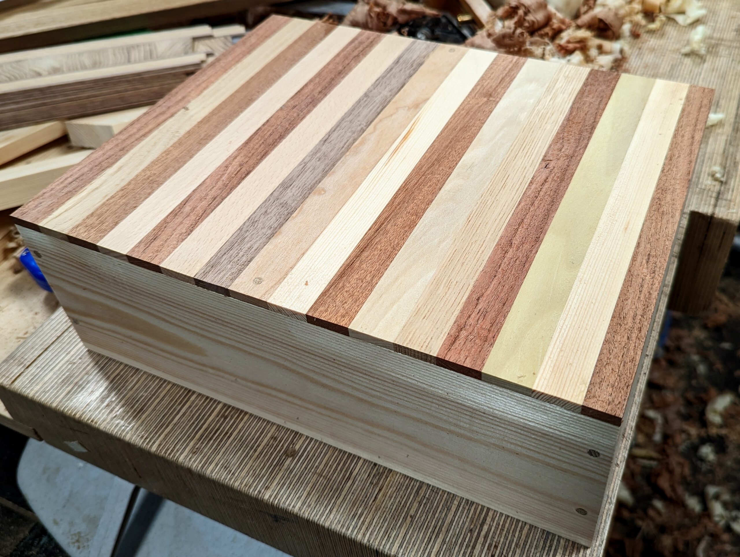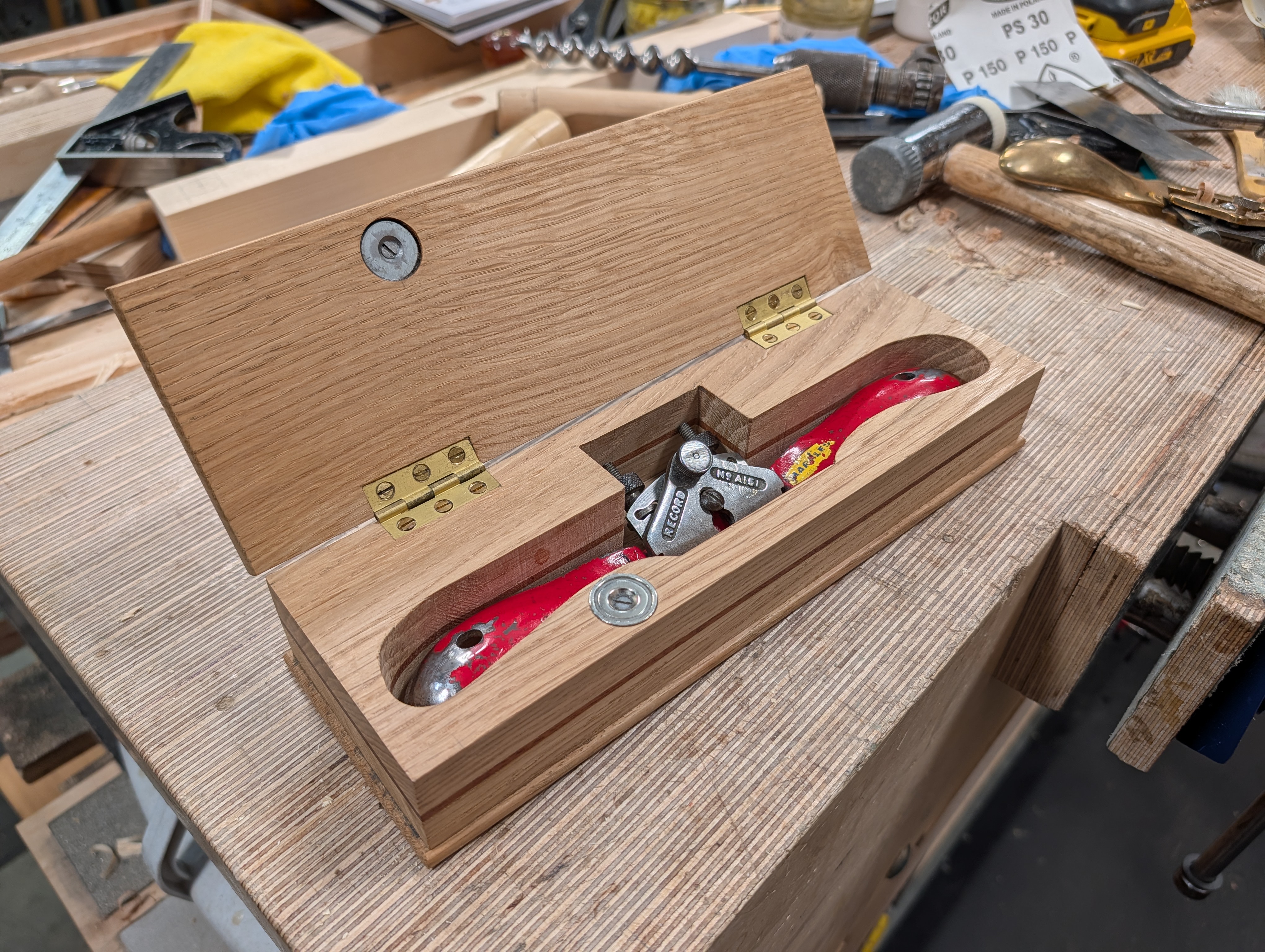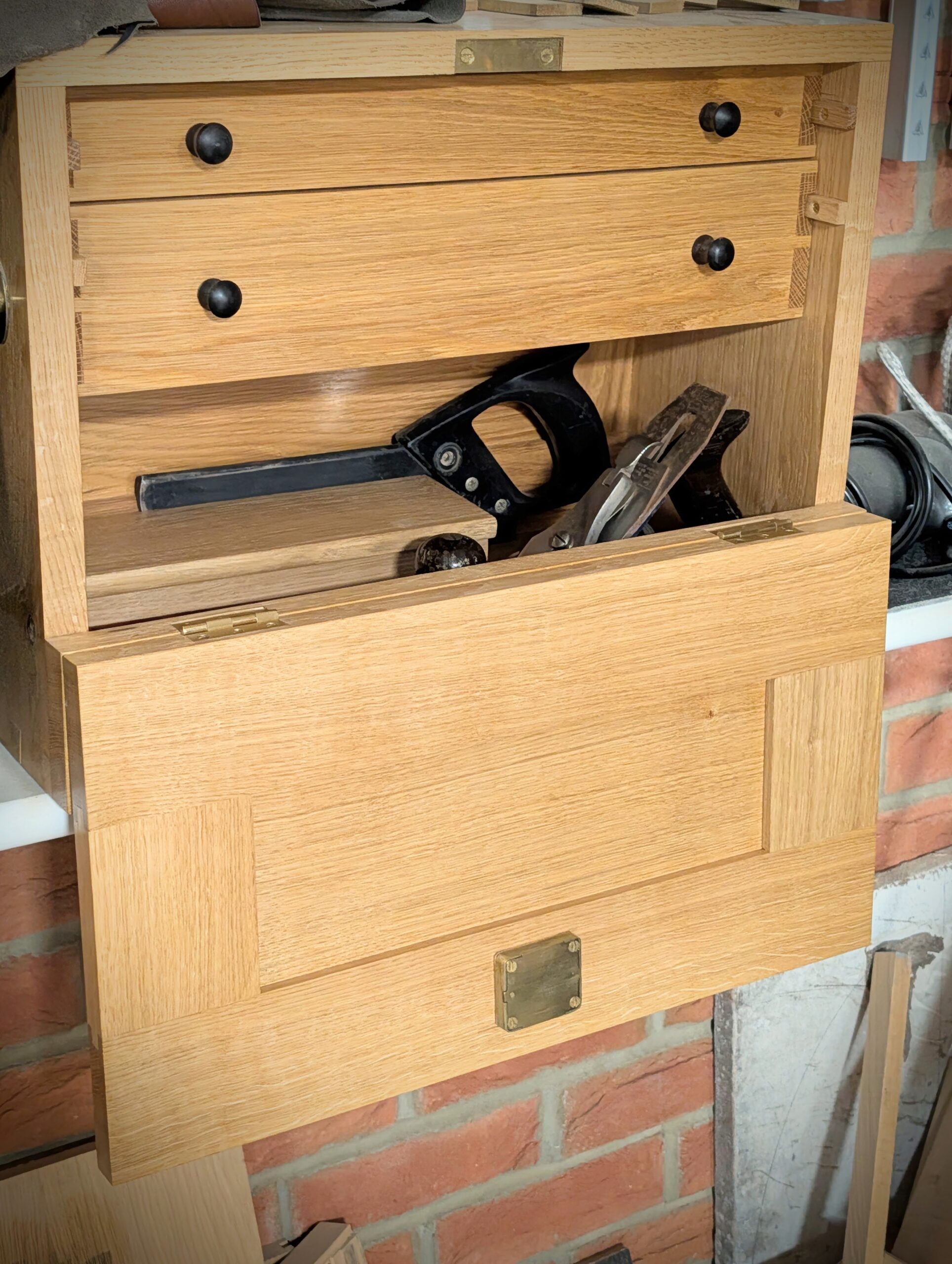 How remarkable is this? We had used a pine extension pole as a 22mm dowel for the rails of her stool and had enough for seven of the eight rails. "Hmm" I said, "We're short a rail. Oh, dear." She dropped from her stool and started scouring the workshop scraps in the corners of the garage until she found a stick of roughly 22mm by 22mm beech, a foot long. "This'll do, I think. Will it granddad?" she said? Then she went to her tool box, an oak one I had made to teach and train my audience on woodworking masterclasses a decade or so ago, and pulled out a small wooden case.