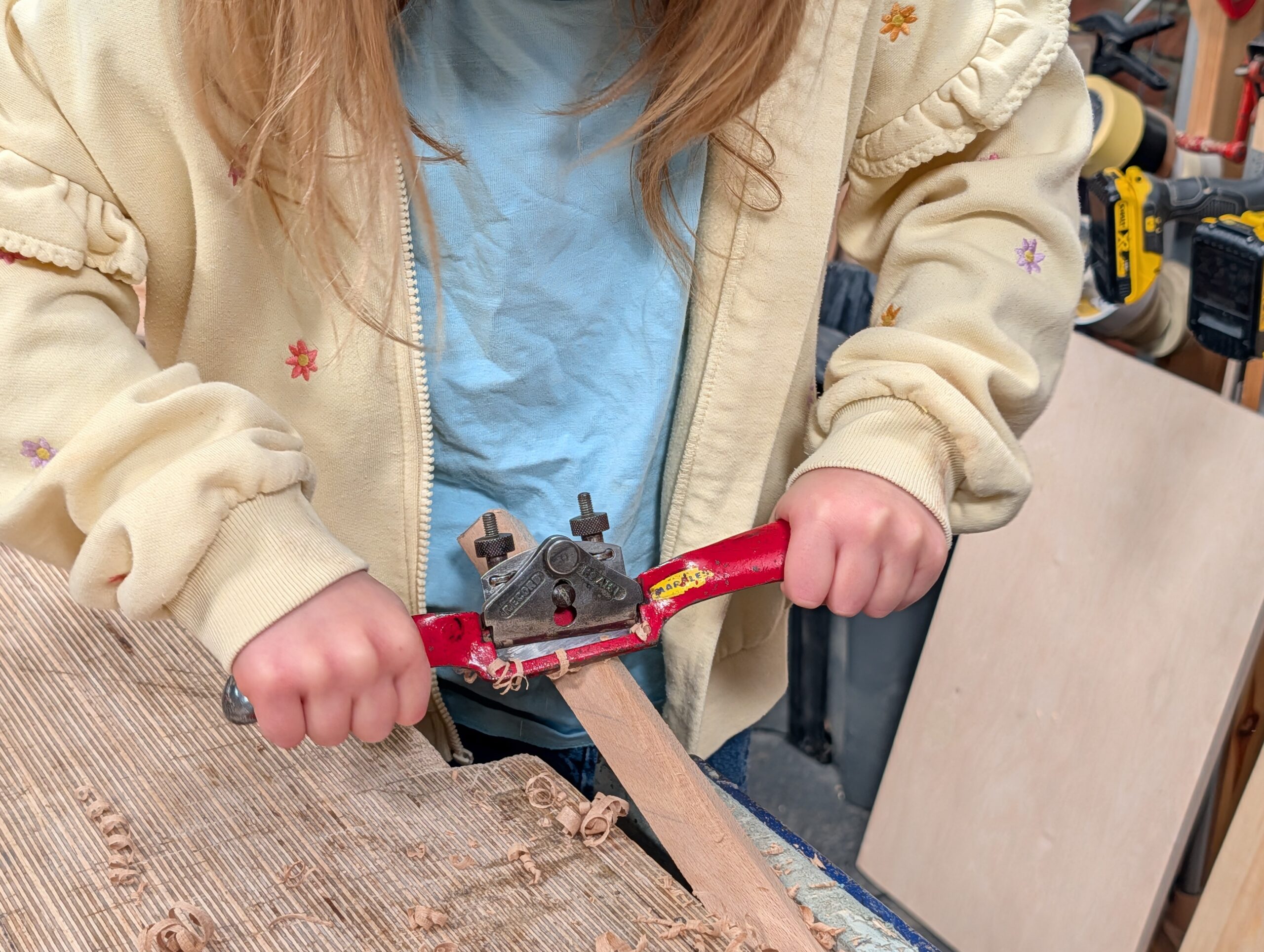 She aptly shifted direction, angled the spokeshave and rolled it to engage the cutting edge to take long shavings she could hear see and feel those few inches from her face. The outcome of early expectations matched her intention stroke on stroke; she peeled away the shavings one after the other by the dozen, but instead of focussing the tool on one spot she moved it rotationally to even out her work of creating a round dowel from a square stick. Without any hesitation, she now knew what to do and how she would do it. For my part, it wasn't pride in her newfound ability, but joy in her discovering that perseverance and fortitude brought results. This then released the reality that we could and did talk back and forth for hours as the brace turned, the spokeshave shaved and shaped, and the card scraper refined the planed wood beneath her still small hands. Woodworking was working, and it was wholly her own energy, her direction and her earned working knowledge of wood and tools that produced the results 99.99% of all the children in the world will never know of in their lives.