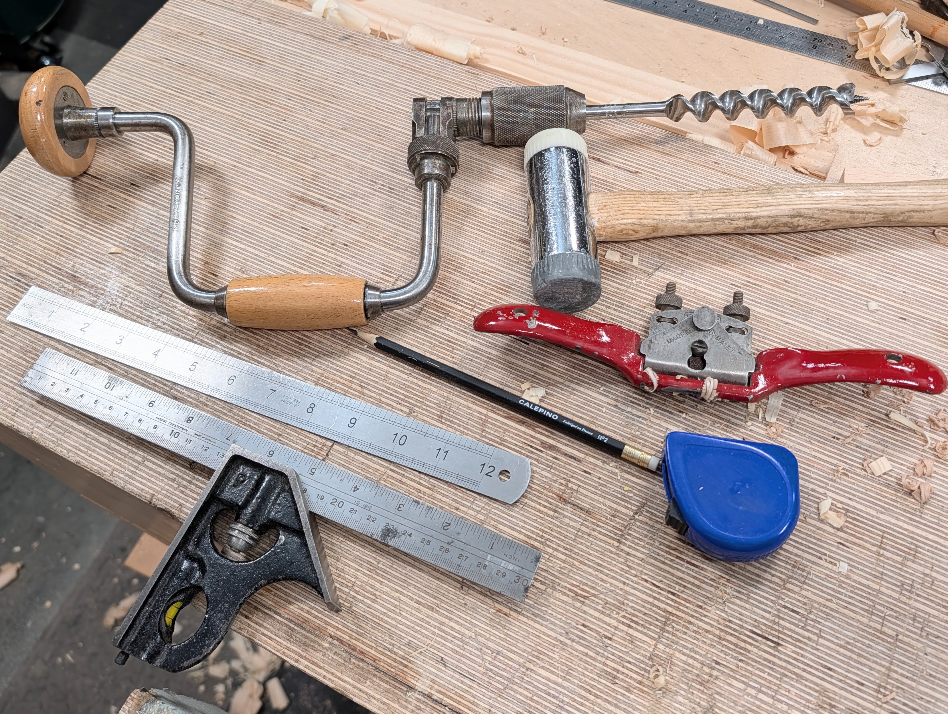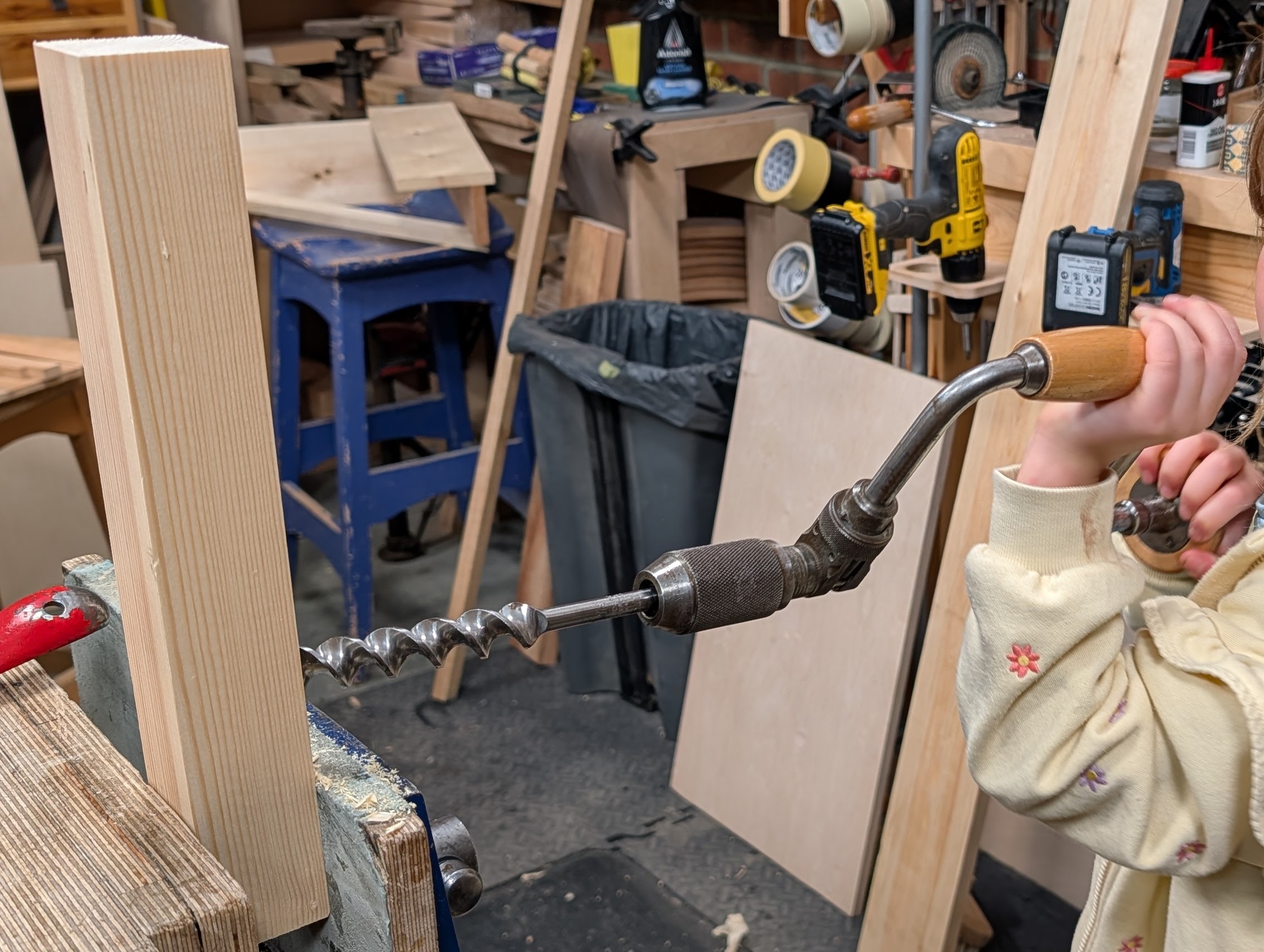But it was the pure association that reawakened the same awareness of teaching and training my own boys when they were the same age as my granddaughter this last Thursday but then some. The pure freshness of time we spent together at my bench with a combination of the tools she now owns and a few of mine. We chatted throughout the time we took to make her stool. She's standing on one of mine as she makes hers. We've created terms like, "finger cleanout" where her small fingers can pluck out the shavings from a 20mm hole. "First the finger cleanout." she says after each of the sixteen holes she just bored with the swing brace (bit brace USA).