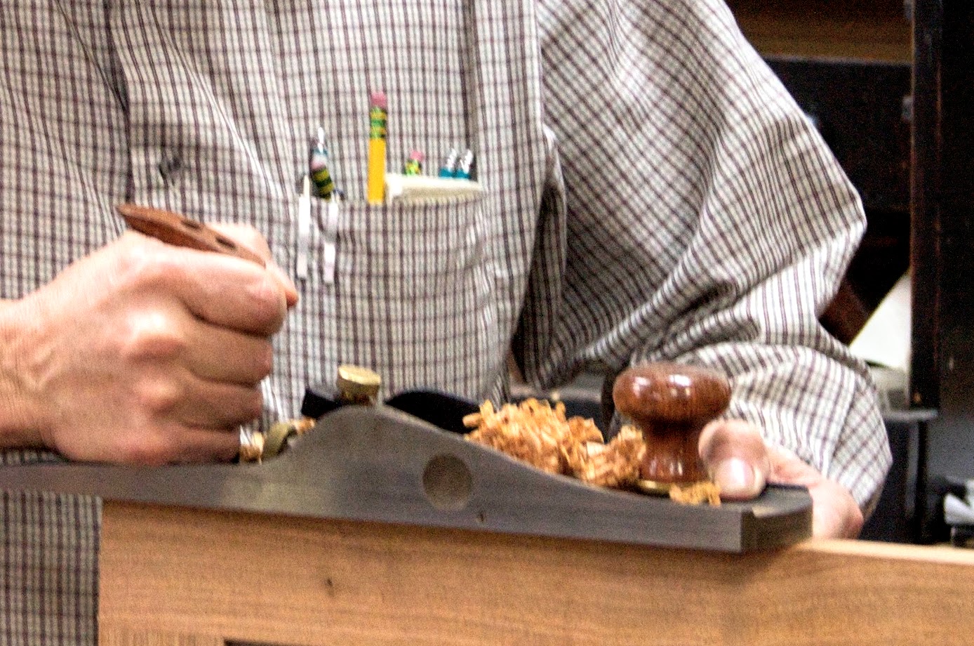 Believe it or not, two hand tools will give adequate success for taming the mesquite. Assuming you have sized your wood to near sizing via a well set up bandsaw, the Stanley smoothing or and jack plane will get you to the final size with a level and trued condition. The work is mainly about sensitivity. My placing of the plane on wood tells me in a fraction of a split second whether I am about to face opposing grain by planing and without taking a single stroke, I can tell if I am about to plane the wrong way. The issue is that that can can change within a few inches, not many, as few as one or two. This then gives me expectation of change needed––tells me to make the split-second spin of my plane end for end on its axis to feel again which way I should go, and that might tell me to go at a tangent or even dead square across at 90º or so across the board. Mesquite grain bucks and twists like a rodeo bronco, and you don't usually know exactly what it will do either. That being so, the critical preface to planing mesquite will always be to sharpen the cutting iron before you take that opening stroke, take shallow depths of cut and be ready to sharpen again in just a few minutes. As I said, mesquite contains masses of silica, and this dulls the plane iron as fast as teak and a couple of other woods. I have a dedicated sharpening station that remains as a constant because of my self-discipline when it comes to sharpening. People say to me, "Do you sharpen every day?" My answer? "How about every few minutes, depending on the wood." Thankfully, I have sharpening freehand down to under a minute a plane iron, and that includes reloading and back to task. Yes, I am fast.