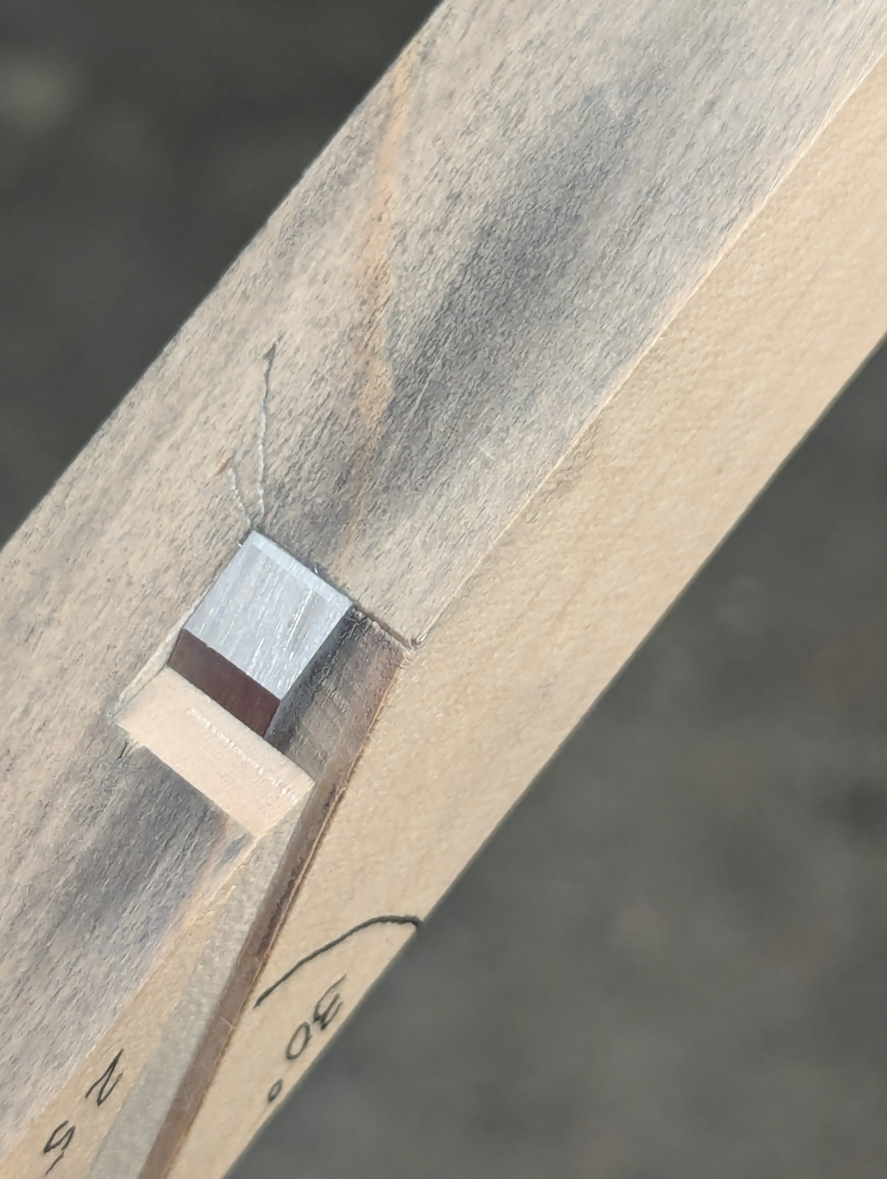My inventiveness on this particular week, now a few weeks ago, required me to cut an arch and to groove said arch a quarter of an inch deep with the alacrity of running a plough plane along a straight edge. I went through four iterations with complexities before realising I was over-engineering for the need. In the end, my new tool took about five minutes to make as an adjustable version, all for the sake of loosening and tightening a single woodscrew. My other unique and inventive 'invention' was another version of my poor-man's router plane. Simply cutting a 55º degree cut with a saw to part a 5" long block 2" by 1" into two angled and matching opposites along its length gave me a bed-angle to angle a chisel to the workpiece; using the same chisel I would ultimately install in the poor man's plane came then to work as the cutting iron to level the bottom of the groove for the chisel in said plane and then too my now arched grooves. These things follow my theory that we woodworkers adopt or adapt what already exists to do a work there was no tool for before. In my world of non-machining as much as possible, I have adopted and adapted many things to expedite work that would be nigh on impossible otherwise.