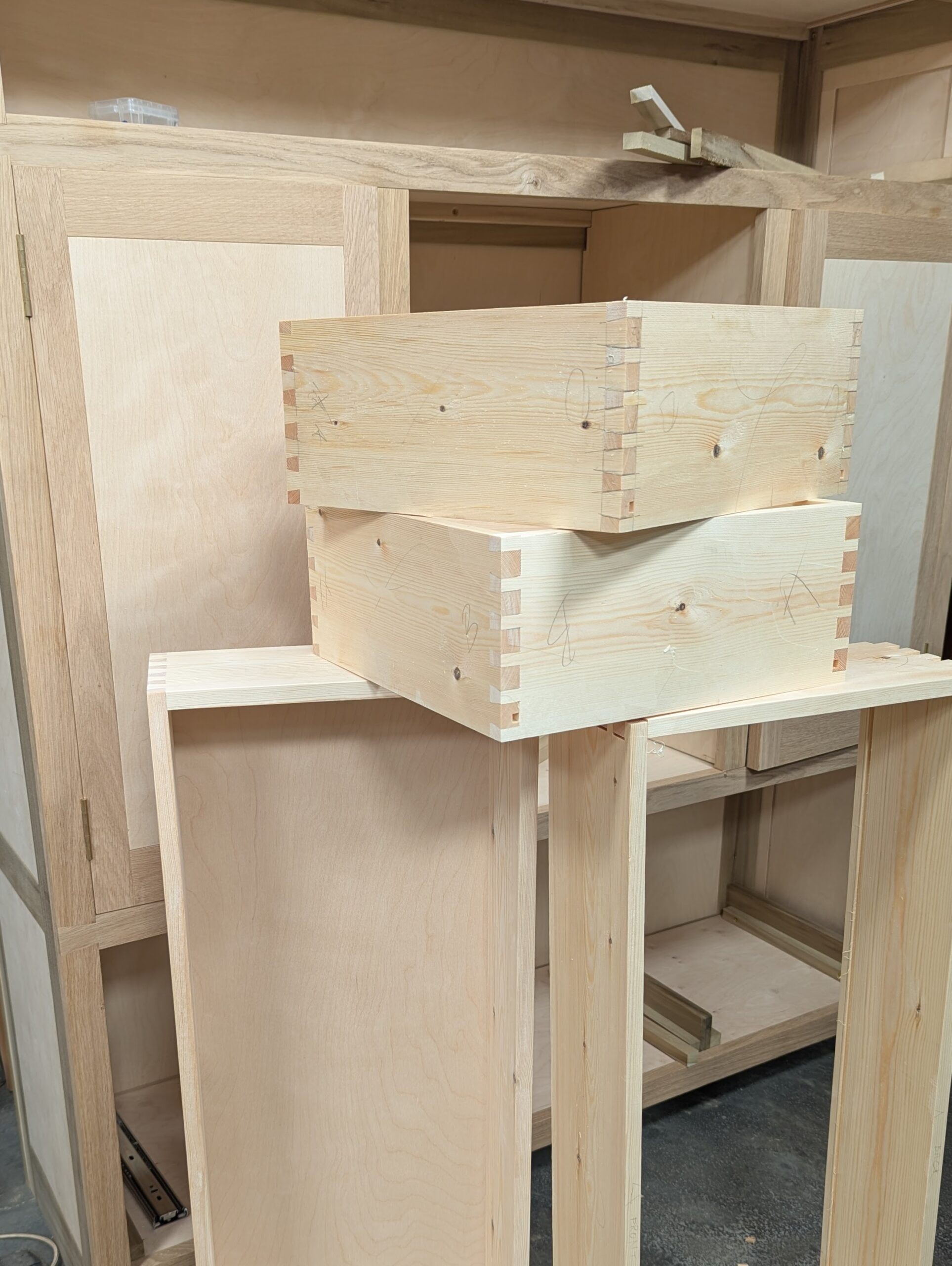 Our hand tool journey in the making is in no way connected to a machine version of anything we do. You cannot just look at the two side by side, the machined against the hand made, and say 'Look, they're the same.' Missing out the journey is to dismiss far too much on our part as hand makers. Machinists dismiss their journey because, well, if it's machined, they've mostly distanced themselves from the demands and processes we, as hand-tool makers, not only welcome but actively seek with our very specific way of making them. That bit in between the wood stacked up ready to make and the appearance of anything looking one like the other is the most important bit. The way you make what you make provides a vehicle for critical thinking, mental acuity and dexterity, and then, too, the physical high demands in all-round exercising of our whole body. Though many try to, this cannot, must not be as merely dismissed as they would like it to be. Hand making and hand powering is wholly intrinsic to who we are as makers, but more than that, it feeds the brain through which we get our strongest sense of what's now identified as our wellbeing. For the majority, even a questionable quality in our making, still gives us a sense of accomplishment and wellbeing. Additionally, we accept that we are on a progressive journey to betterment and that one day we will be cutting perfection into our days of woodworking. We should never try to dismiss this. These cabinet drawers took me a day to make, including grooving the drawers with a plough plane and cutting and fitting the birch plywood drawer bottoms...handwork without machines makes it inclusive for rich and poor alike. I like that my working methods have democratised woodworking on a global level. Imagine that much power to the real power of woodworking.