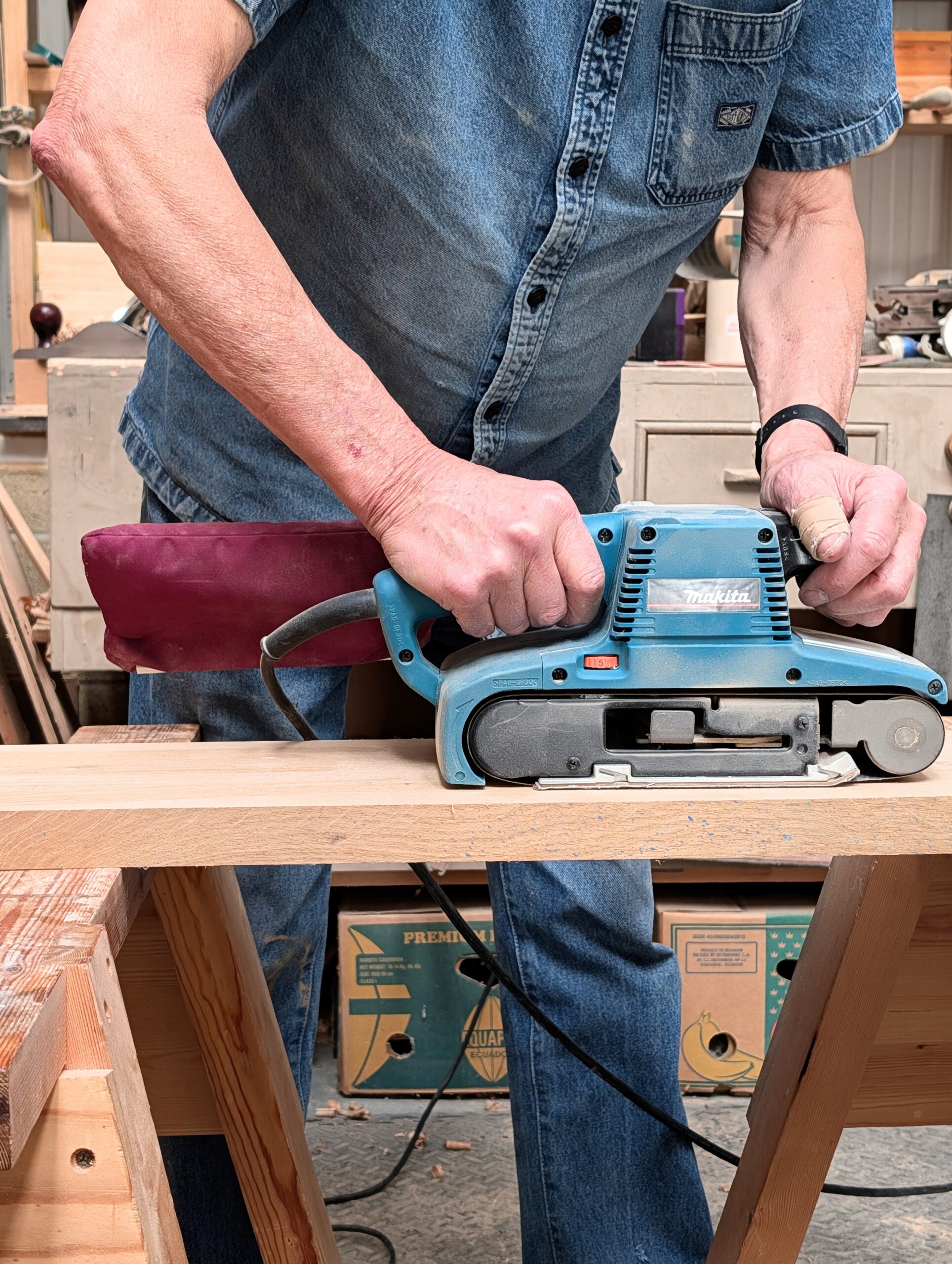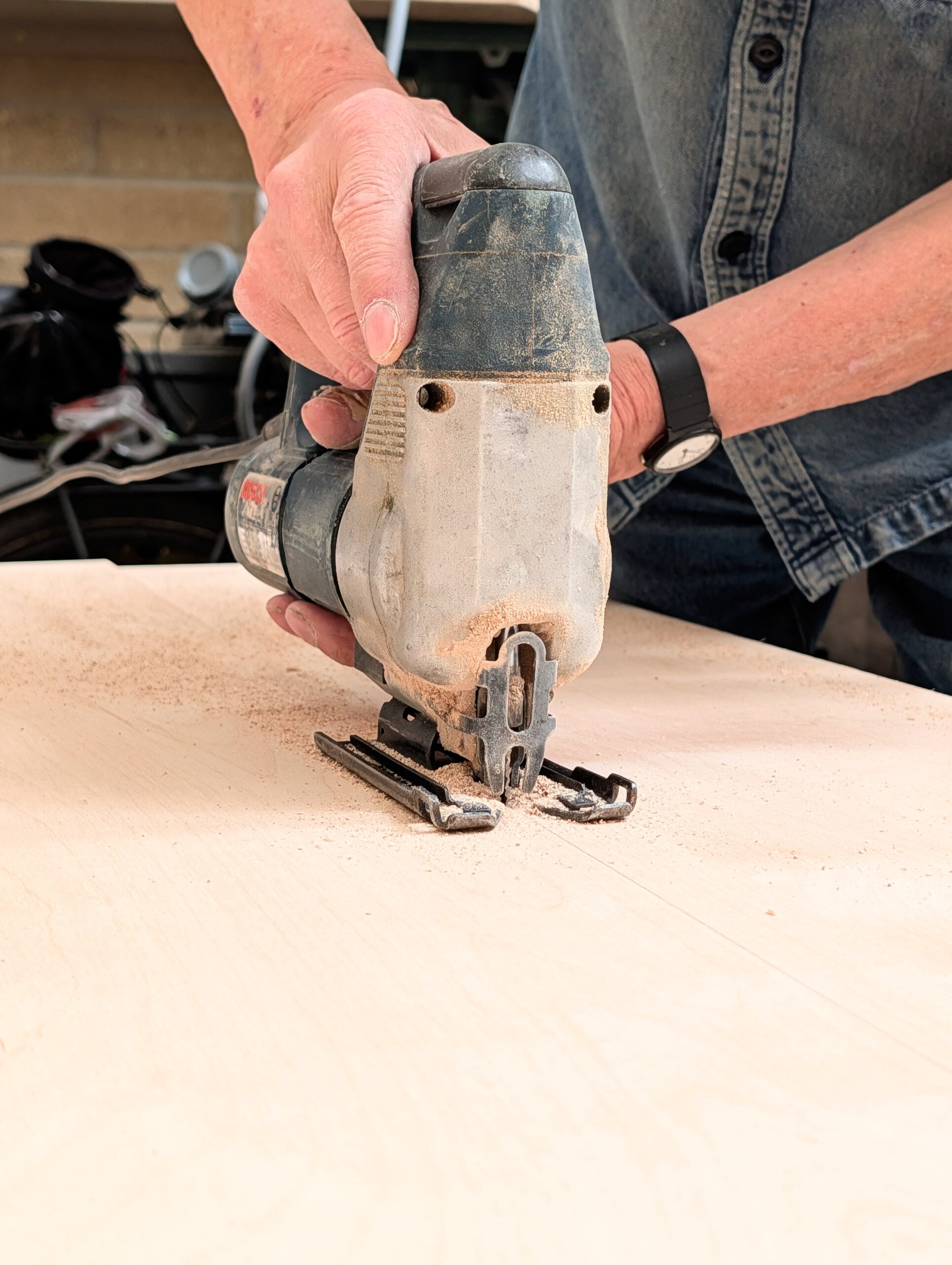 Hand held machines have their place in my world, I'm just not so hooked on them as most people woodworking. Because I am always on my own with a higher output to input the audience I have, a jigsaw on 3/4" birch plywood making long cuts to reduce size makes good sense for an almost 76-year-old. These sheets are twice as heavy as those made from Malaysian woods sold in big box stores. I can lift them and move them fine after sixty years of doing so, but time is a factor, considering everything else I do is handwork. I don't have nor do I want a tablesaw, jointer, planer again in my shop.